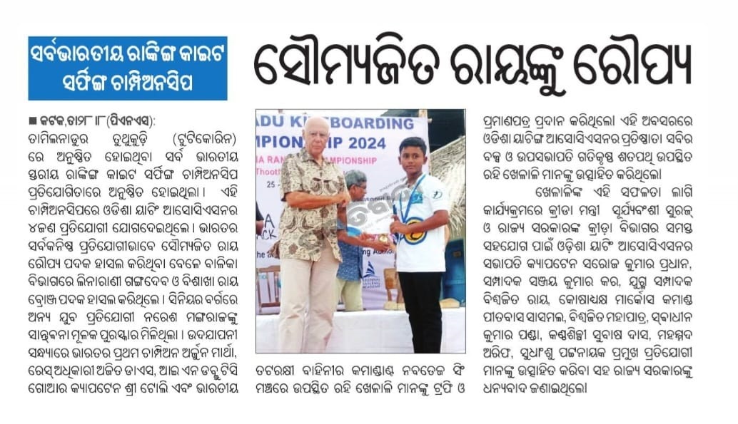 "12-Year-Old Soumyajeet Ray (Kriss) from Odisha Yachting Association Becomes Youngest Kite Surfer in India to Win Silver at National Kiteboarding Championship"