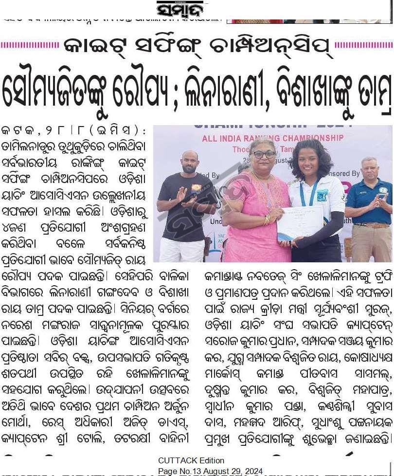 "17-Year-Old Bisakha Ray (Sital) from Odisha Yachting Association Becomes Youngest Female Kite Surfer in India to Win Bronze at National Kiteboarding Championship"